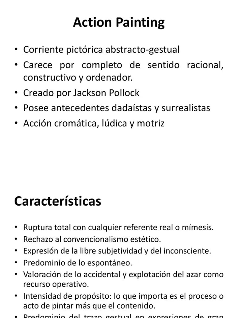 17/08/2015 · la "action painting" americana tuvo dos tendencias. Parece que se anexiona al verdadero espacio. La primera representada por pollock, kline y de kooning, cuyas características principales eran: La primera representada por pollock, kline y de kooning, cuyas características principales eran:. 11/11/2020 · action painting is an art movement that began in the 1940s and challenged the traditional ideas of using familiar objects and themes in paintings.